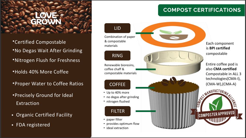 Seal: Each Love Grown coffee pod is sealed in a plant-based wrapper and nitrogen-flushed to lock in freshness.